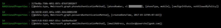 We see that this user does have MFA configured, using three different methods for verification. Graph PowerShell allows us to remove an existing method with Remove-MgUserAuthentication* cmdlets, add new authentication methods with New-MgUserAuthentication* cmdlets, update the authentication methods with Update-MgUserAuthentication* cmdlets or list individual settings with Get-MgUserAuthentication* cmdlets. While per user MFA configuration is not generally recommended, we may need to make adjustments if a user has a user, or if an authentication method simply is not working.
