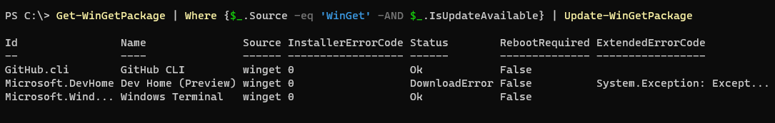Remember, the PowerShell commands are wrappers for the underlying winget command-line tool. The PowerShell module doesn't add any features that you can't do with winget. What you do get are PowerShell features like pipeline support and -WhatIf.