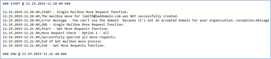 For this scenario, we have an Exchange-to-Exchange Online migration where we are moving over 10,000 mailboxes, from multiple geographical regions to a single Exchange Online tenant. While moving these users, we have a script (like the one previously written about here and here) that administrators are utilizing for migrations. To further enhance this script, we can use PowerShell to generate logs for critical items in the script.