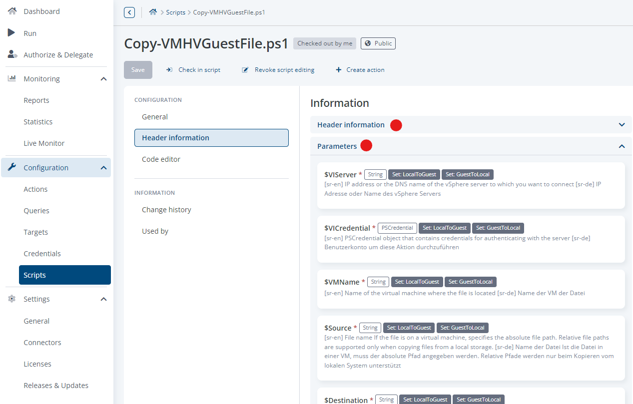 After checking out the script, it can be edited in the code editor. The user dialogs for the functions 'Commit', 'Revoke' and 'Discard changes' have now been harmonized. Changes to scripts by different administrators can be tracked as usual under the properties in the 'Change history' tab.