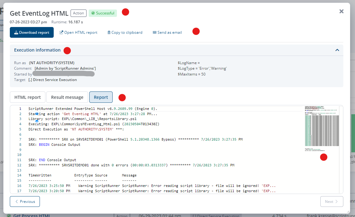 Conceptually, the view for the PowerShell 'Report' has been completely revised and redeveloped. In the top line, you can immediately see whether an action or a script query generated the report. The next line gives information about the time of execution, the execution duration and an indicator if it was a scheduled execution. In an action line, all possible interactions for the report can be selected.