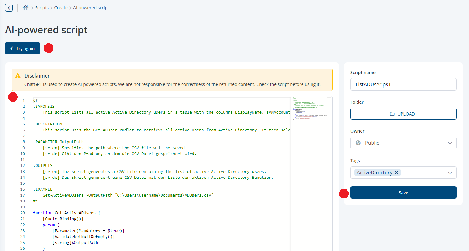 By clicking the 'Generate script' button, the request is sent to the AI. The AI generates a corresponding proposal for the script code. The process can also be repeated.