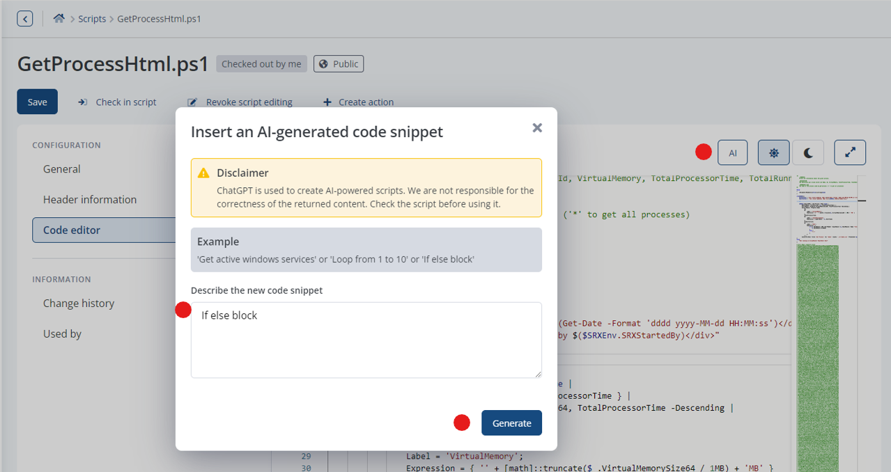 AI support can also be used in already generated or existing scripts, regardless of whether the script was created with AI or not. To do this, the script first has to be checked out. Then move the cursor to the corresponding position in the code editor and press the 'AI' button or CTRL-F1. The AI popup window will open. Enter the description of the desired code snippet in the text field and click 'Generate'. The code snippet generated by the AI will be inserted at the cursor position.