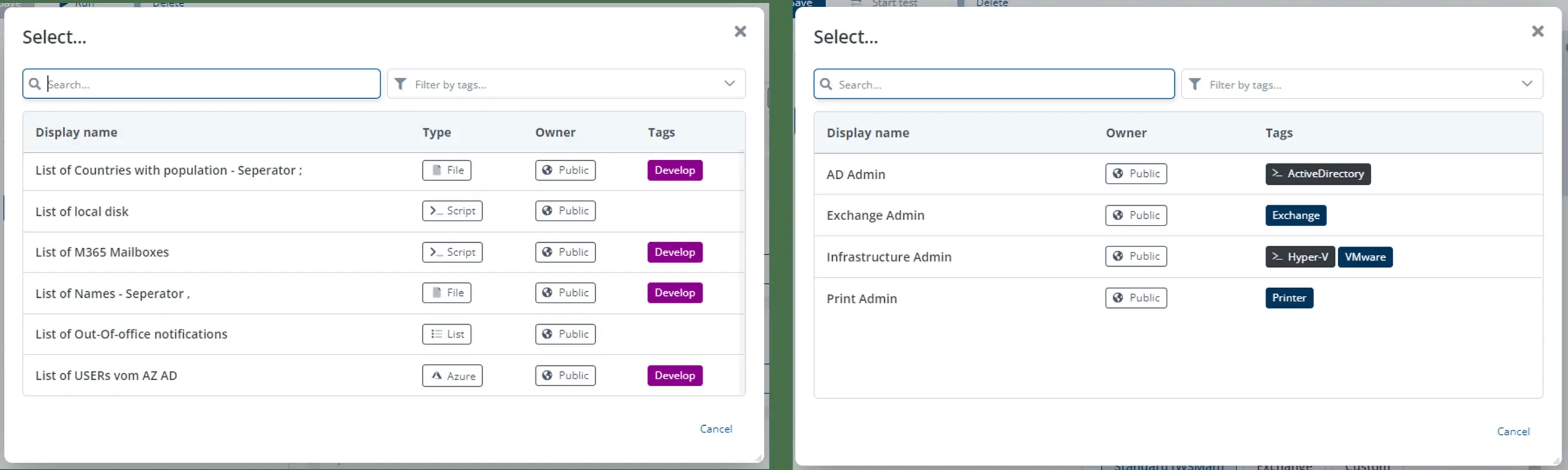 To improve and harmonize the configuration of elements, new selection dialogs have been developed for actions, queries, targets and credentials. The change from simple drop-down to list selection now allows searching and finding as well as filtering of elements in a large number of entries. A distinction is made between multi-select and single-select dialogs, discernible by the selection boxes.
