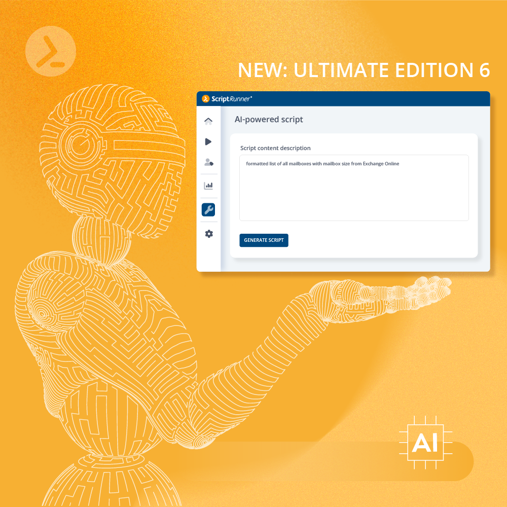 The core element of Ultimate Edition 6 is Artificial Intelligence (AI). With the help of AI-powered script development, our customers can create new PowerShell scripts as well as extend existing scripts. AI is also becoming a game changer for automation, and we will be expanding the feature set considerably in future releases: Scripting, creating queries and use cases in ScriptRunner will be significantly easier.