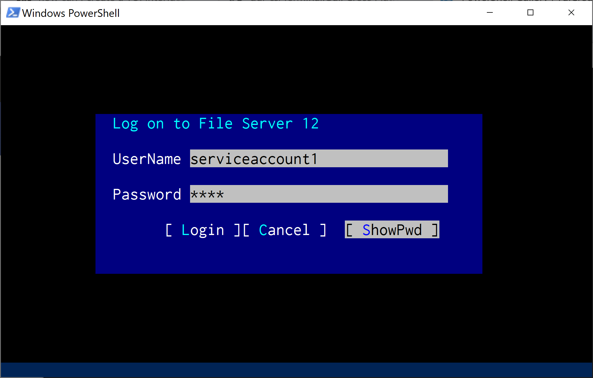 PS> Show-CredentialDialog -Title 'Log on to File Server 12' -UserName serviceaccount1 -AllowToggle This inserts a custom title, prefilled username, and a toggle button to switch between masked and clear text input.