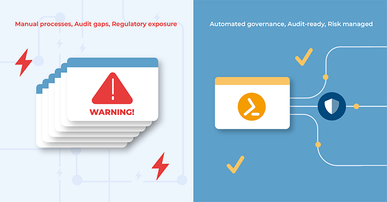 Traditional governance relies heavily on manual processes that cannot keep pace with the increasing automation of enterprises. Manual approval processes create operational bottlenecks that undermine compliance objectives. Teams find shortcuts during crunch time. When auditors arrive later, they discover gaps between what's documented and what actually happened.