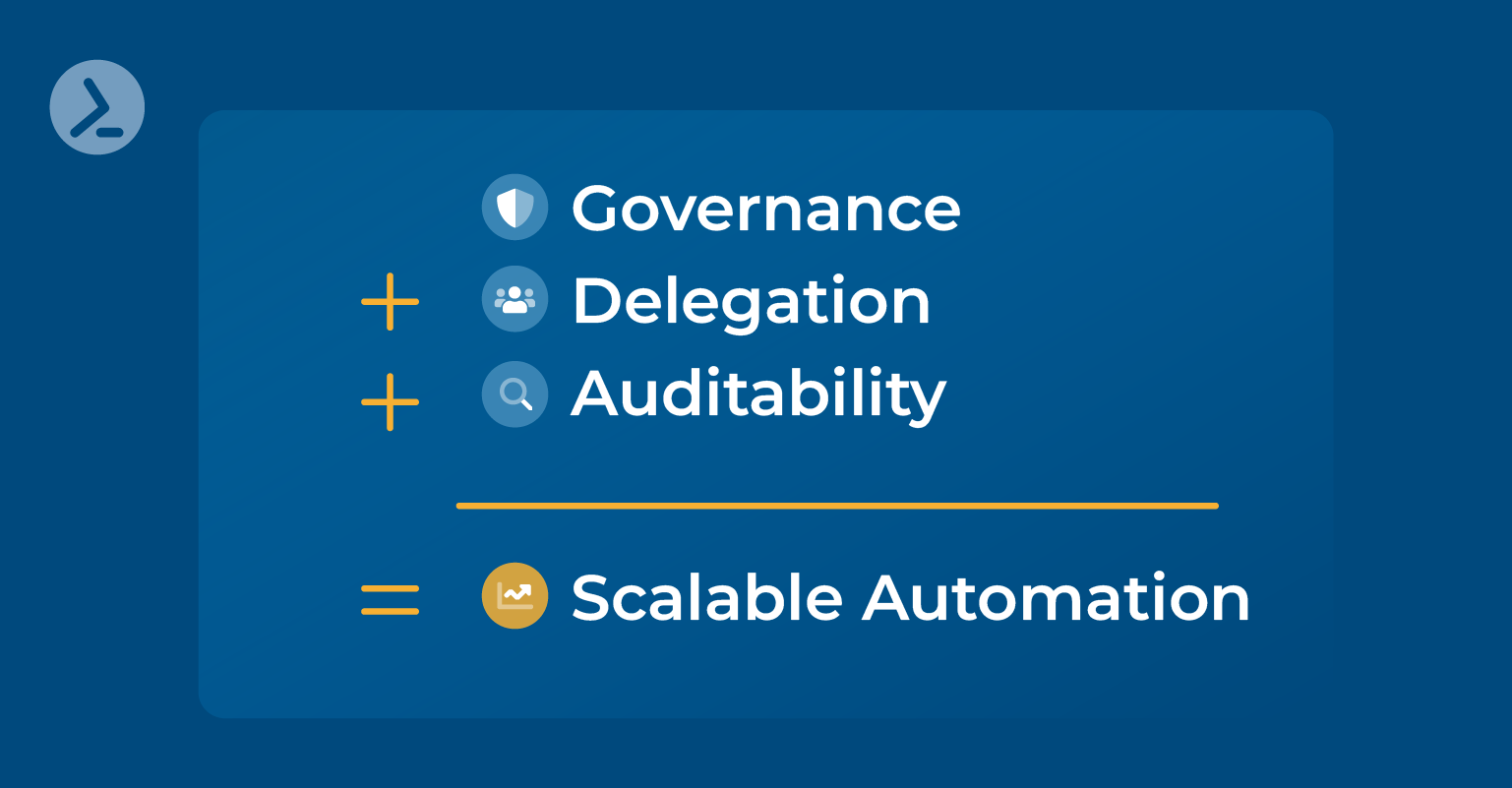 Three things make or break your automation when you scale it. Governance, delegated execution, and auditability form the foundation for secure, scalable operations, particularly in environments where PowerShell serves as the primary scripting platform.